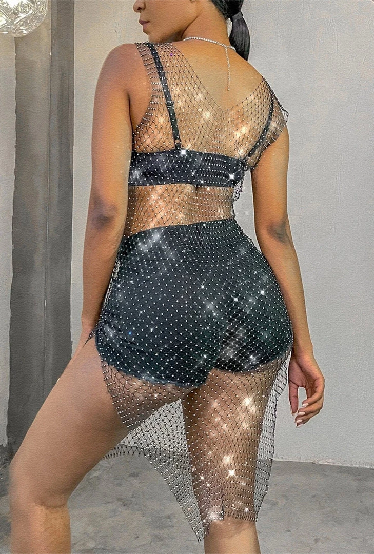 Shine bright like a diamond in this Fishnet Dress! Fishnet Dress is made out of a Black Net Material with Rhinestones and has a v neck cut and side splits. One size fits most.