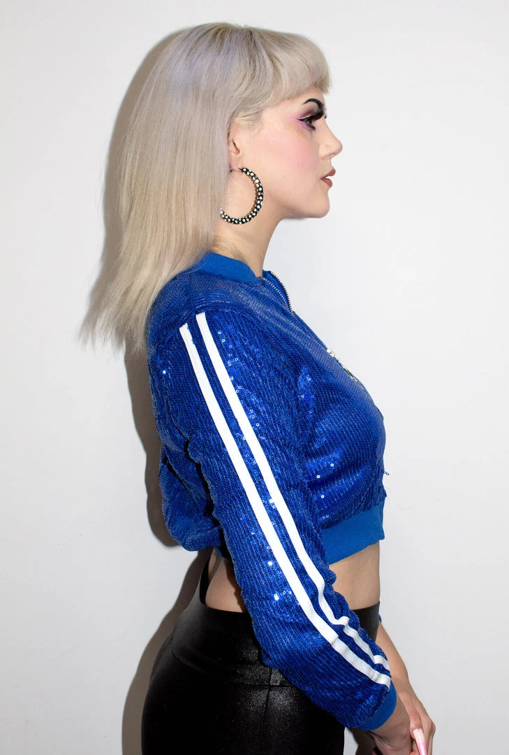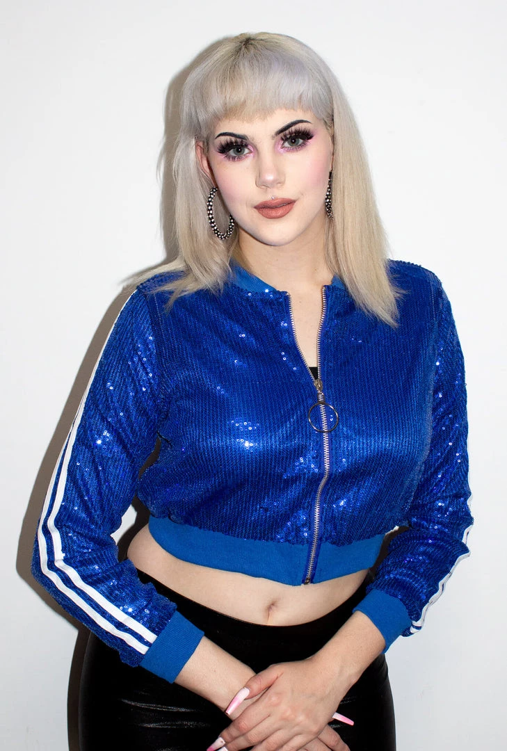 Our super cute blue mini sporty bomber jacket is the ultimate edgy jacket you need! Sequin bomber features an all over sequin material with Blue Ribbed Trim, Two Stripes going down on the sleeves and an O ring front zipper closure. This jacket is a mini cropped style fit. One Size fits AU 6 – 10.
