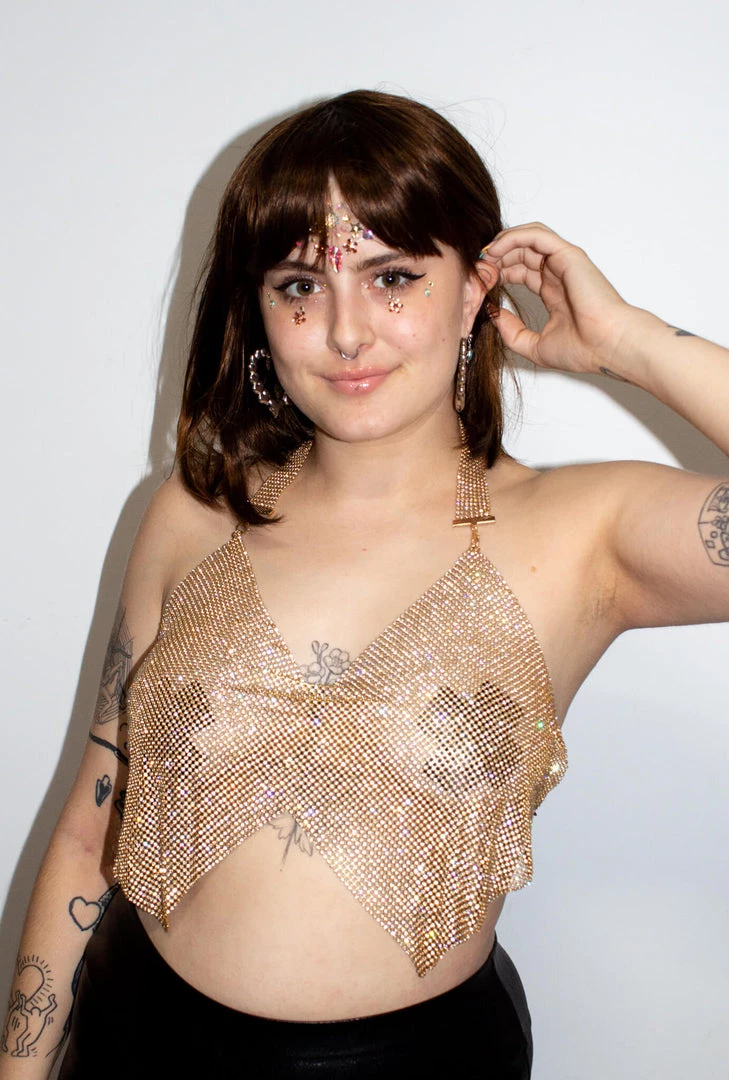 Our stunning Gold Rhinestone Metal Mesh Diamond Cut Top features a symmetrical diamond cut-out with a rhinestone halter neck. The top has a halter chain and clasp closure and an adjustable chain closure at the back. One size fits AU 8 – 12.