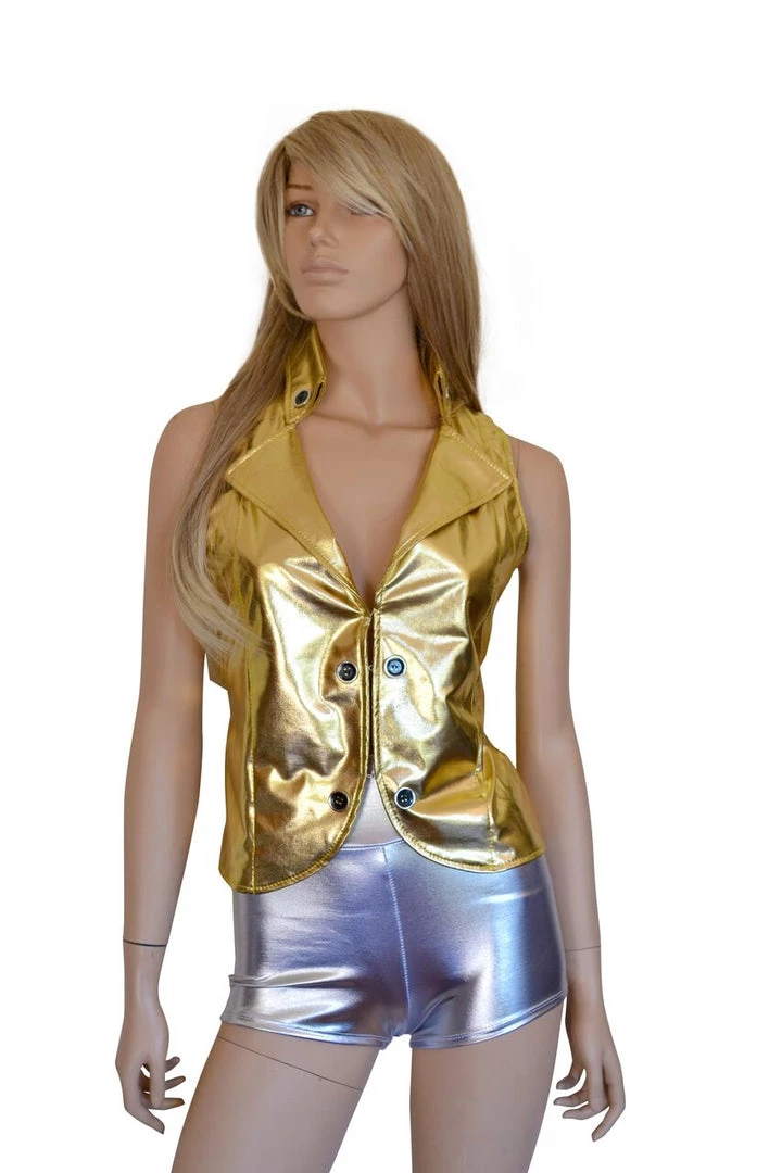 Gold vest featuring large collar, hook and eye closure in the front and tie at the waist in the back.