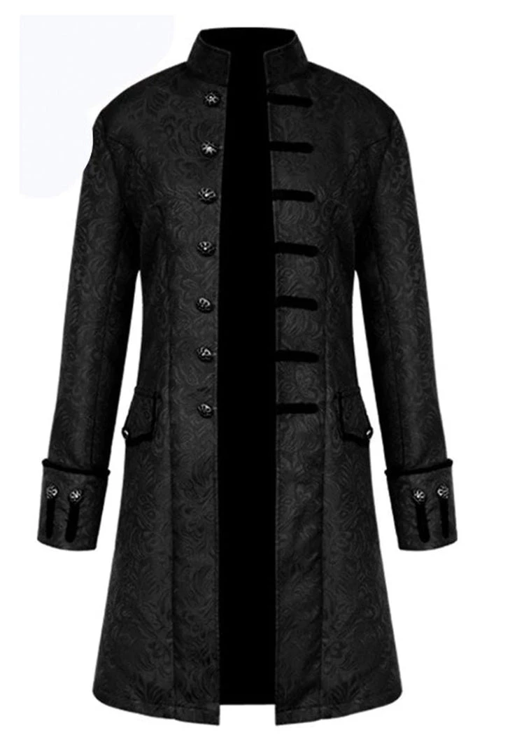 - Black velveteen lapels all the way down the front, matching collar, fake pocket flaps, and upturned pointed cuffs.