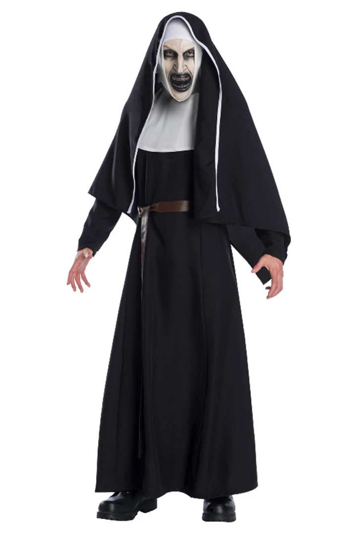 The Nun Costume includes a Long black polyester dress with separate white yoke style collar, a Long black habit headpiece with white trim Faux leather, a brown belt with a small buckle, a Vinyl face mask with painted details and eye and mouth holes cut out. Shoes not included.