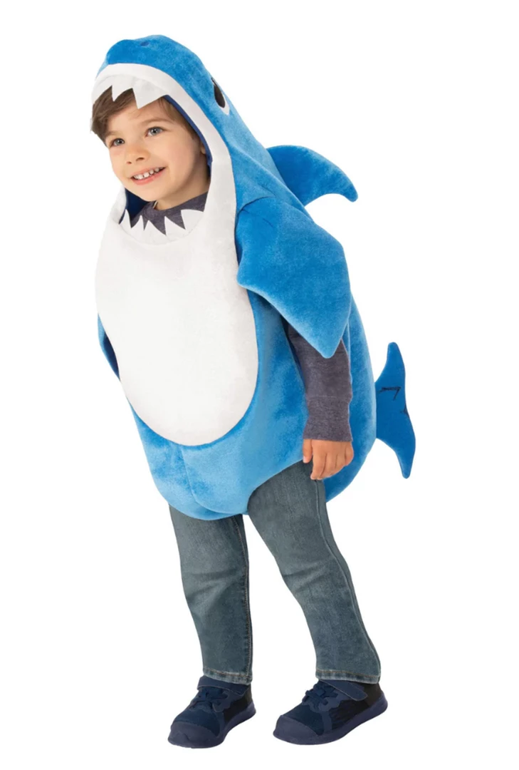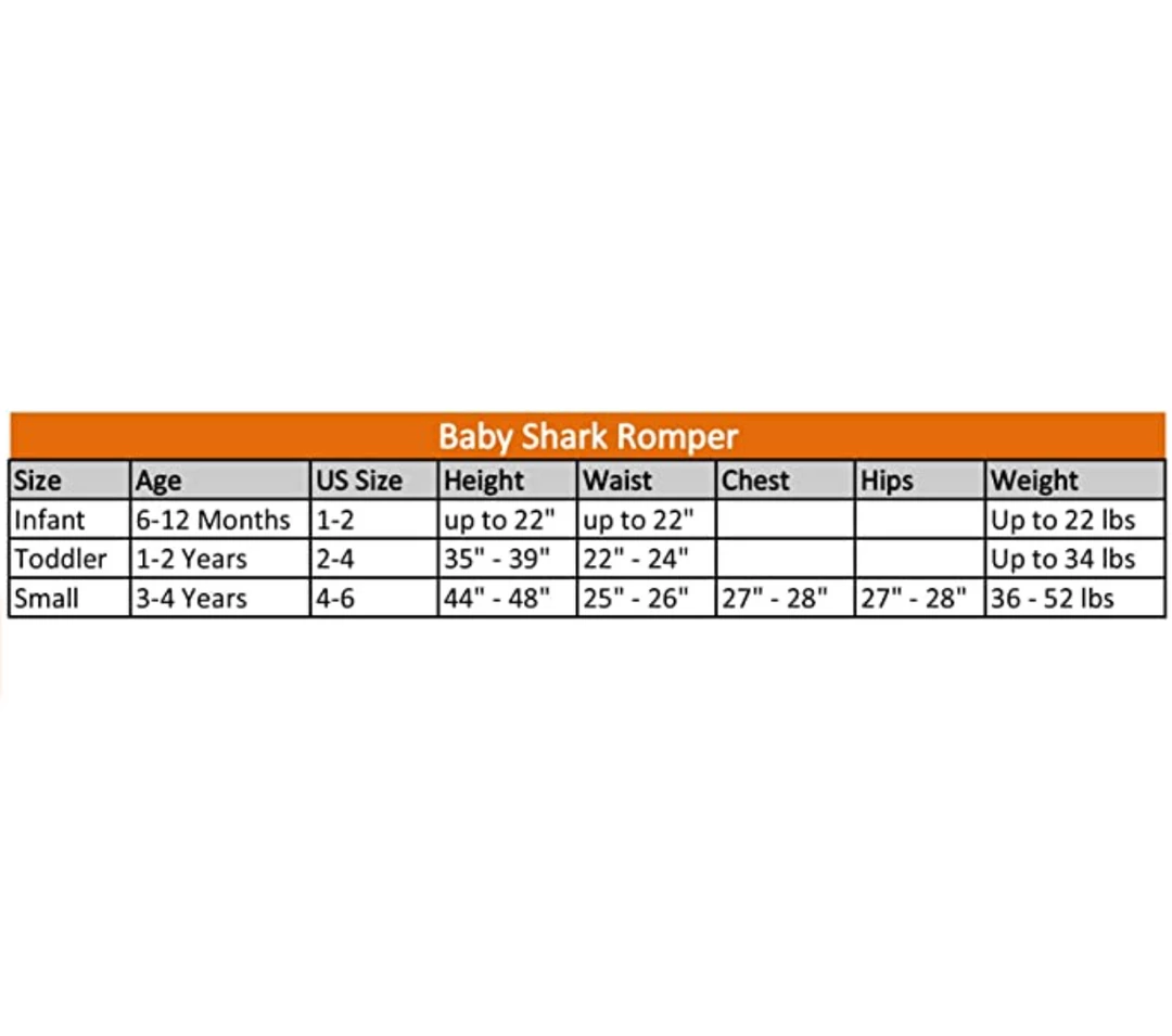 Baby shark, do, do, do-do, do-do! Our kids Blue baby shark romper costume has side-fin shoulder covers; dorsal fin and tail-fin in back, an attached shark character hooded headpiece with teeth lined face opening and original sing sound chip with on/off switch.