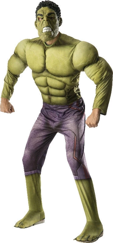 This one size fits most delux Hulk Costume includes the muscle chest jumpsuit, the shoe covers and the mask.