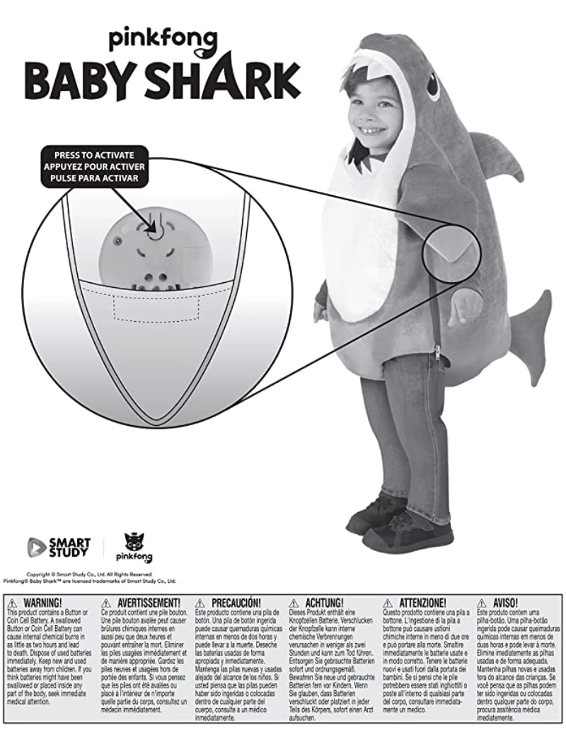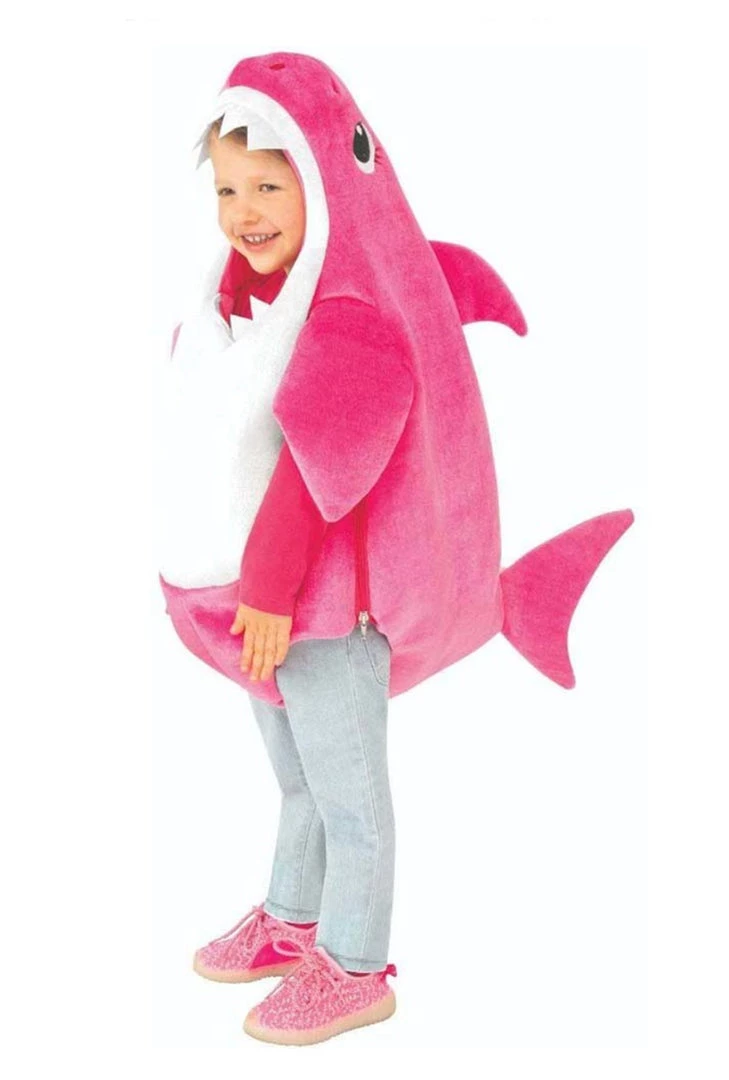 Baby shark, do, do, do-do, do-do! Our kids pink baby shark romper costume has side-fin shoulder covers; dorsal fin and tail-fin in back, an attached shark character hooded headpiece with teeth lined face opening and original sing sound chip with on/off switch.