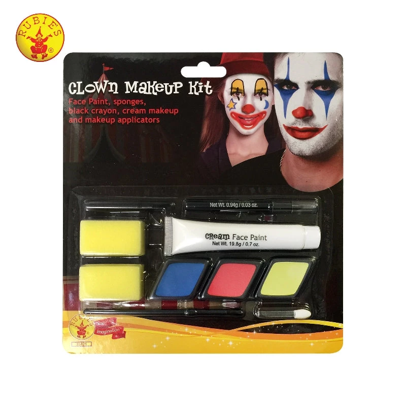 Includes One white tube crème face paint, Three coloured paints with brush and eye pencil, Two sponge applicators. Perfect accessory for a clown costume.