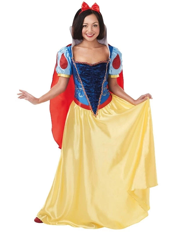 Costume includes Deluxe Full length dress with flowing satin skirt, a Bodice with ruched panel and printed detail, an Upright white satin collar, a Detachable red cape & a red bow satin headband.