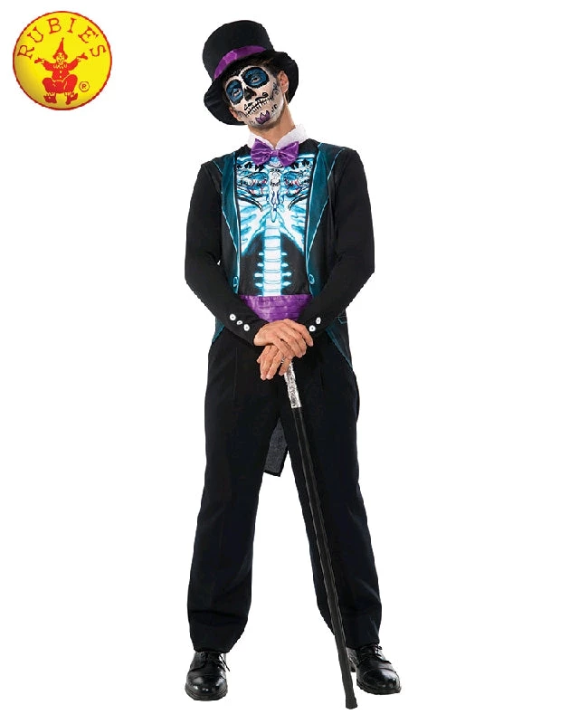 Get dressed up for Halloween in this awesome X-Ray print skeleton suit. Includes: Soft Top Hat, Tail Coat with attached shirt front, cummerbund and bowtie.
