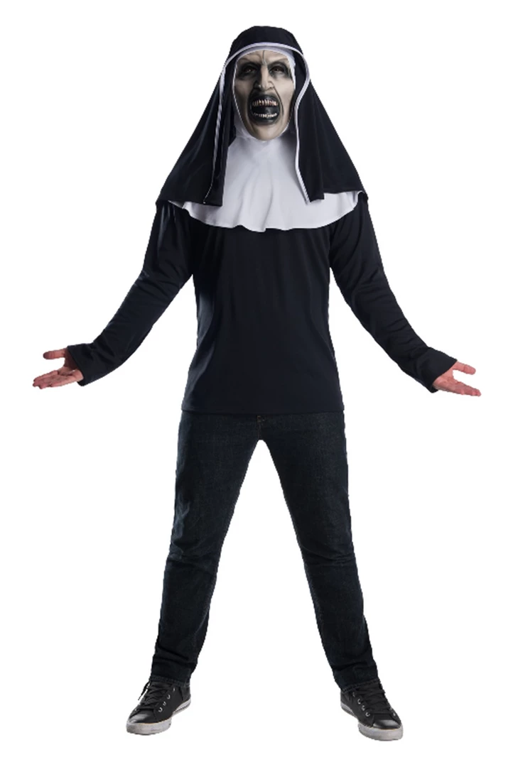 The Nun Top Set includes a Black polyester top with attached white hood and yoke, a Black habit headpiece with white trim and a Vinyl face mask with painted details and eye and mouth holes cut out.