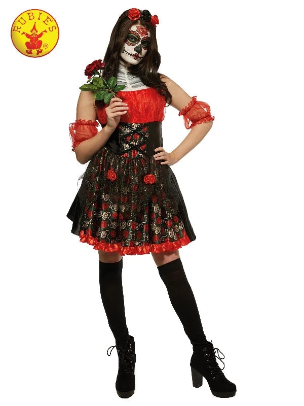 - Satin dress with flower and skull digital print on bodice and skirt plus sewn on satin roses at waistline and lacy peplum overlay
