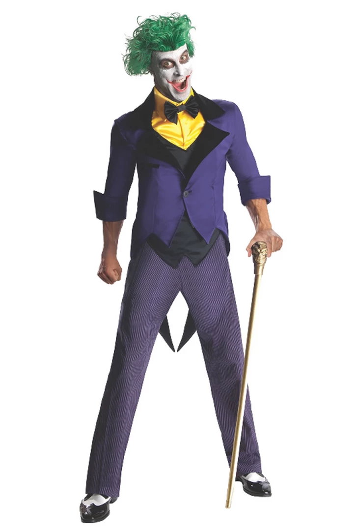 The Joker Costume includes a Jacket with tails and faux chest pocket, an attached vest, shirt fronts and bow tie, pinstriped pants.