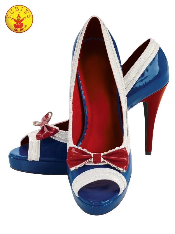 Complete your Sailor Outfit with these red, white and blue Sailor Heels. Take to the high seas with these perfect pumps! Costume shoes featuring high heels and red, white and blue colourways. Shoes have a red bow in front. The perfect accessory for your Sailor, Navy Lady or your Pin-up costume!