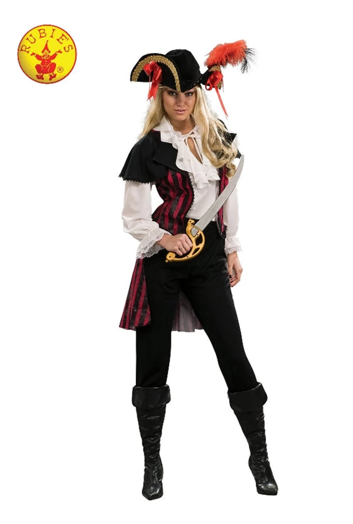 - Pirate style blouse with ruffled sleeves and collar feature plus attached jacket in stripy red and black material. Jacket piece has short black sleeves with tattered hem