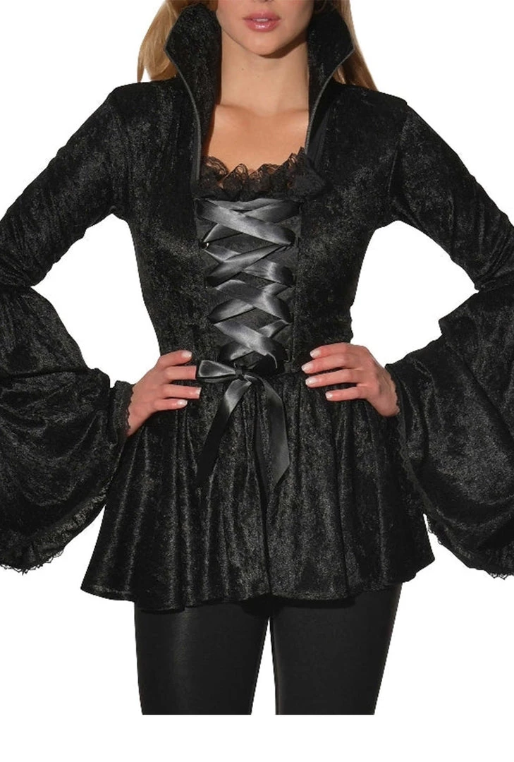 Cackle, cackle, cackle! Cast your spell as you stir your magic cauldron before riding your broomstick into the night. Maybe your black cat will join you for the ride? This is the perfect outfit for Halloween or Book Fun Day! Includes crushed velvet, long sleeved corset top with feature trumpet sleeves and high collar. Top has satin criss-cross ties at front and lace neckline.