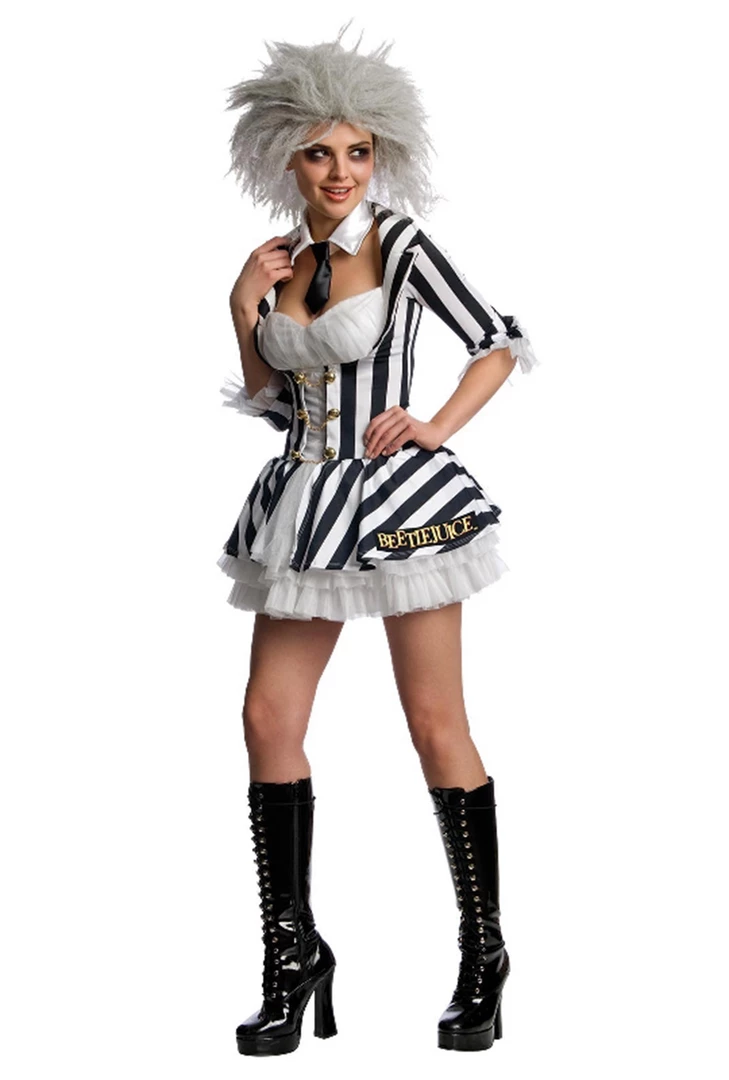 This Sexy and Cute Beetlejuice Costume includes a dress with a stripey mock jacket with lapel collar, a sweetheart neckline with an attached mock shirt with ruched tulle over polyester bustier, gold buttons with attached chains on jacket front and elbow length sleeves with tulle frill, a layered mini skirt with tulle ruffles and stripey overlay with Beetlejuice emblem print, a Satin skirt collar choker with attached mini satin tie and a Grey wig with the iconic messy style!