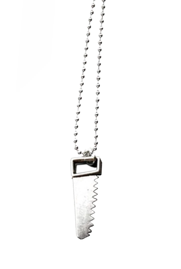 Our Silver Saw Necklace features a long length ball chain necklace with a saw pendant.