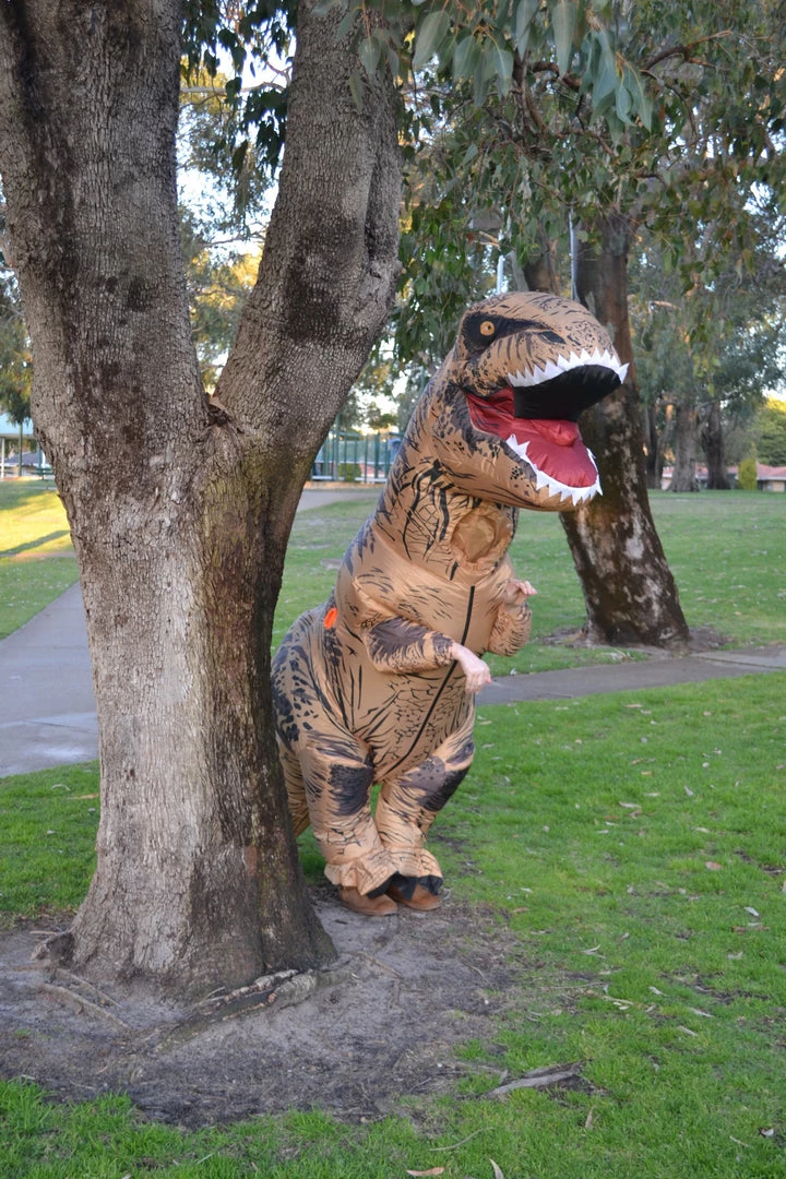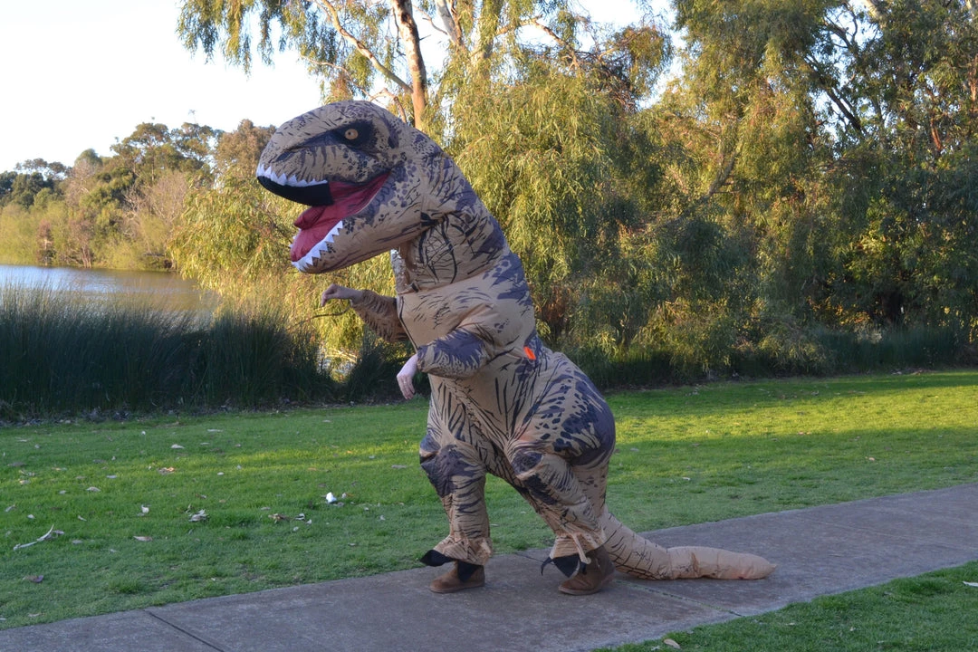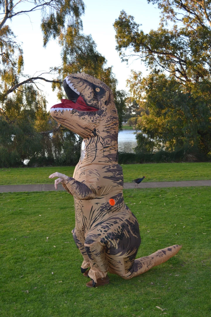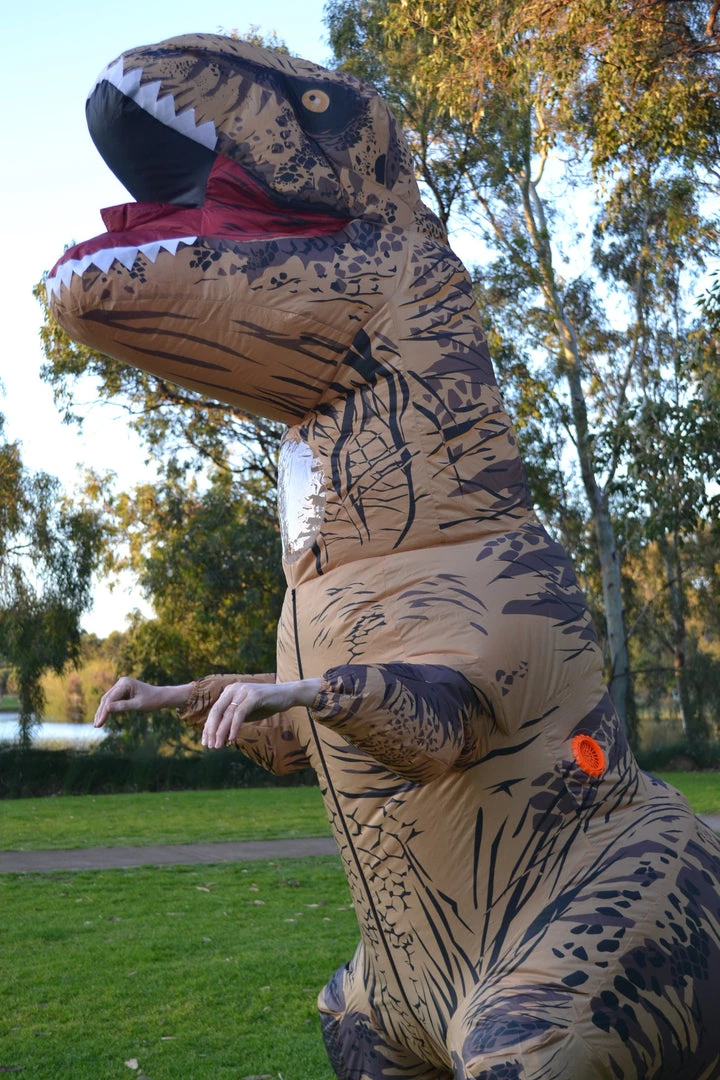 Stand out from the crowd at your next party in that eye catching inflatable T-Rex costume. The two attached fans will keep you inflated all day (or night) long.
