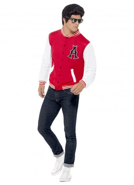 Costume jacket with press stud button closure white sleeves, white trimmed pockets and the letter A on the chest.