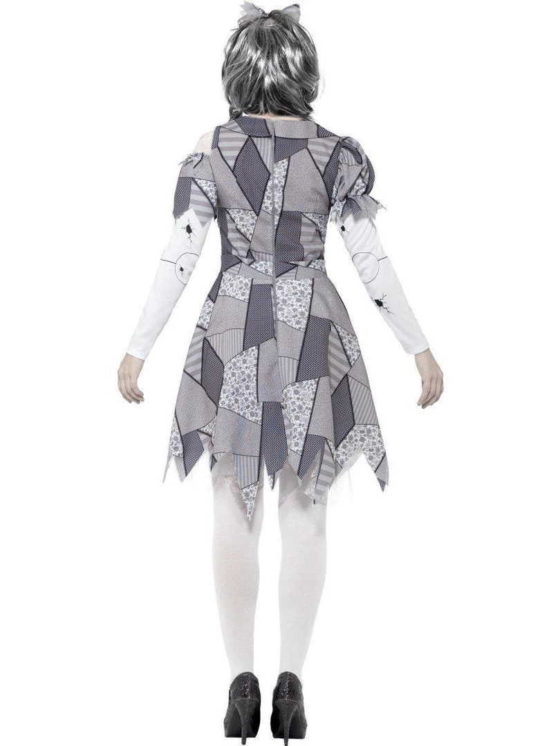 Damaged Doll Costume comes complete with the All in One Grey Patchwork Dress with the Floral Pattern and Stripes along with the Tattered Netted Hem, Buttons and Bow Around the Waist. The Dress also includes the Long White Sleeves with Cracks Printed and Puffed Shoulders. Completing the Look is the Matching Bow Headband.