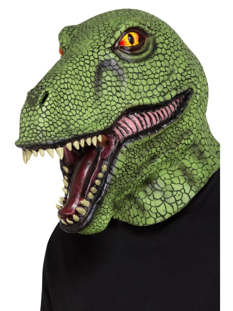 Become the most dominant predator from the Jurassic era in our Dinosaur Mask. The terrifying Dinosaurs mask features the velociraptor a smart pack hunter with brown scaly skin, jagged teeth and orange piercing eyes. The latex mask fits the whole head to become a fearsome dino!