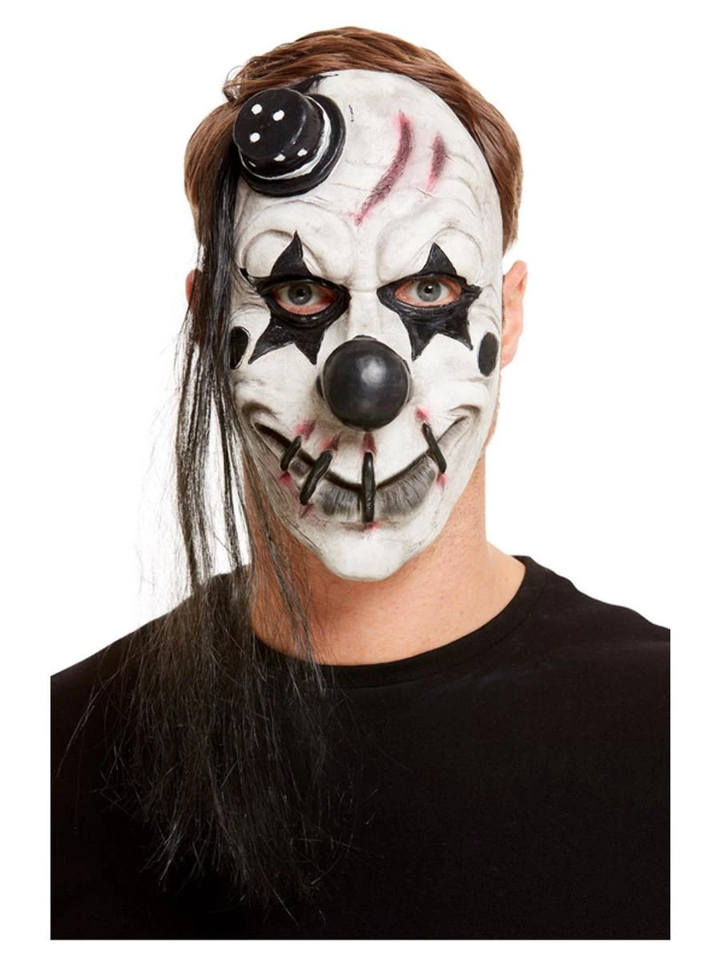 Black and white scary clown latex mask with star eye makeup, stitched mouth and attached mini top hat.