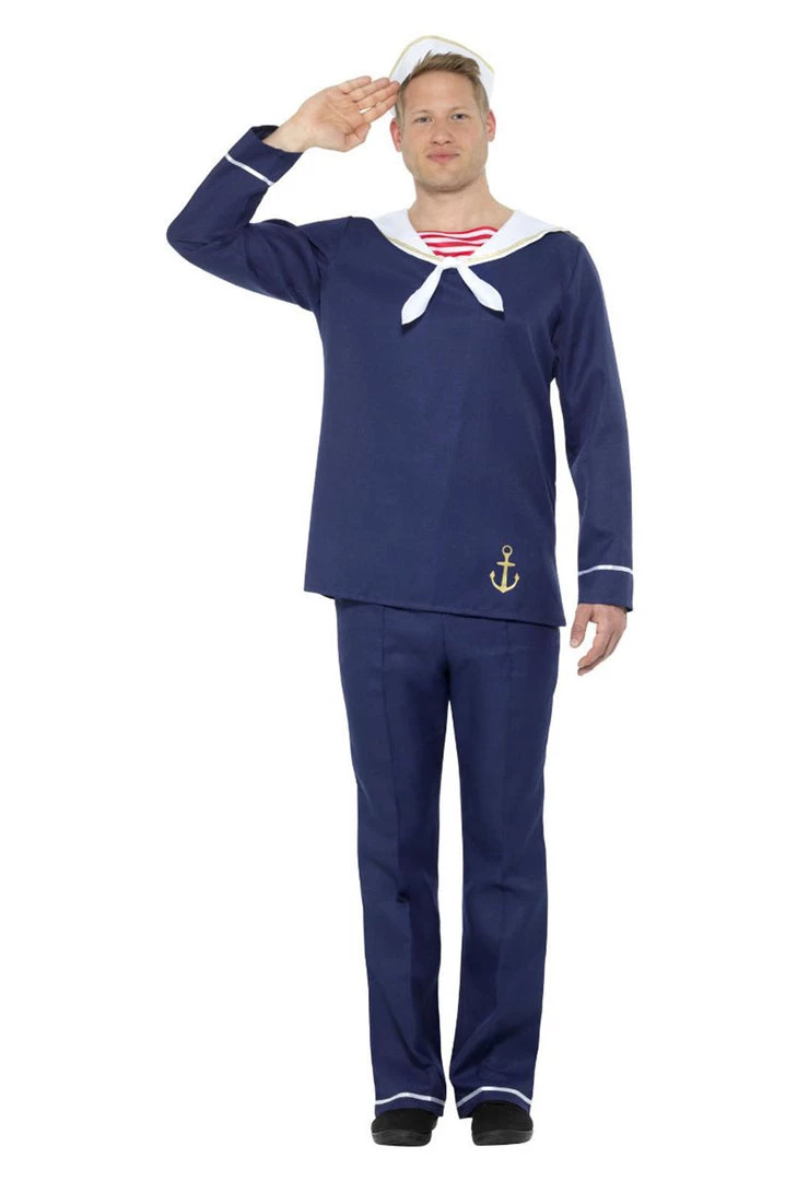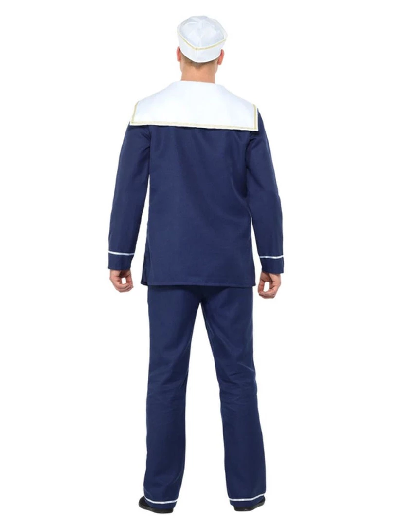 Land Ahoy! Get ready to set sail with this blue and white sailor costume! Including a blue long sleeved shirt with white collar and anchor detail, blue trousers, and white sailor hat, this costume is a complete look for your next naval party!