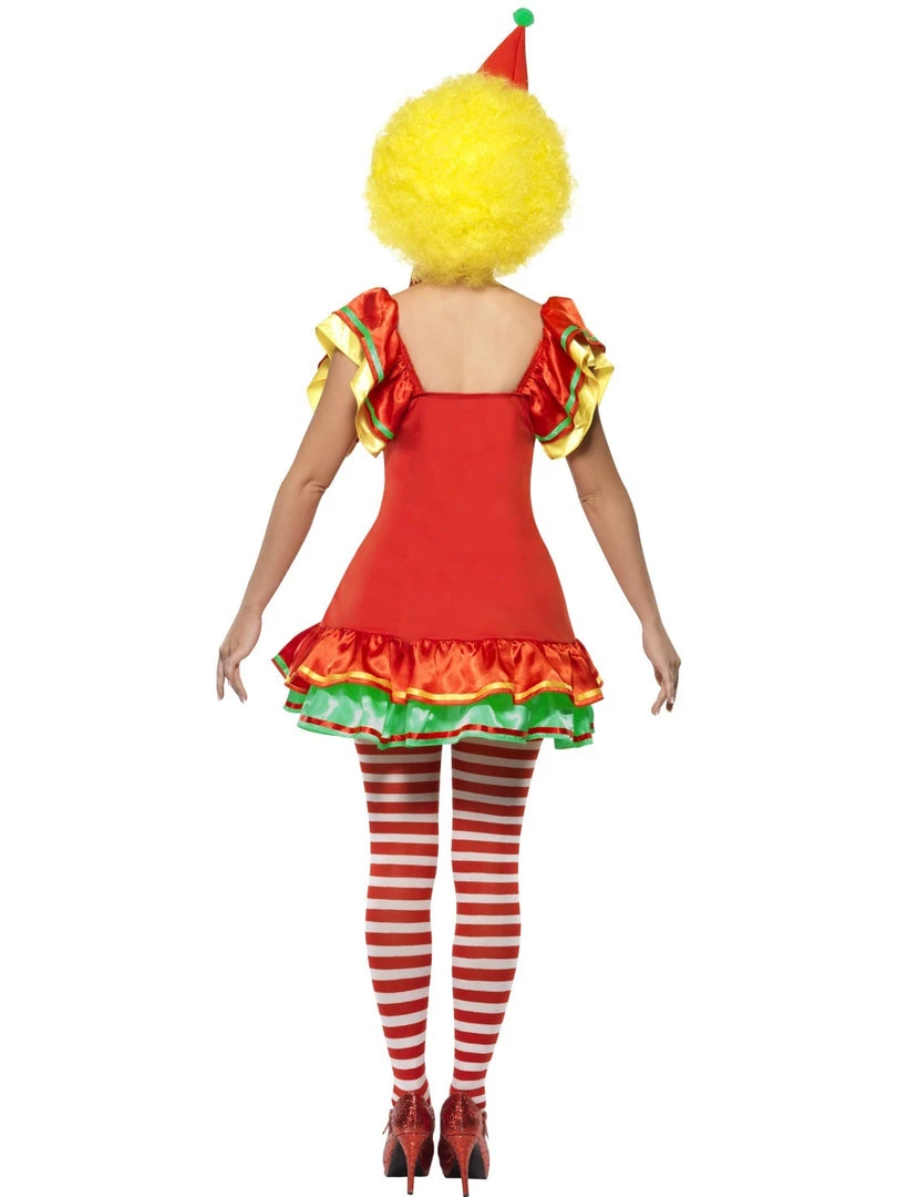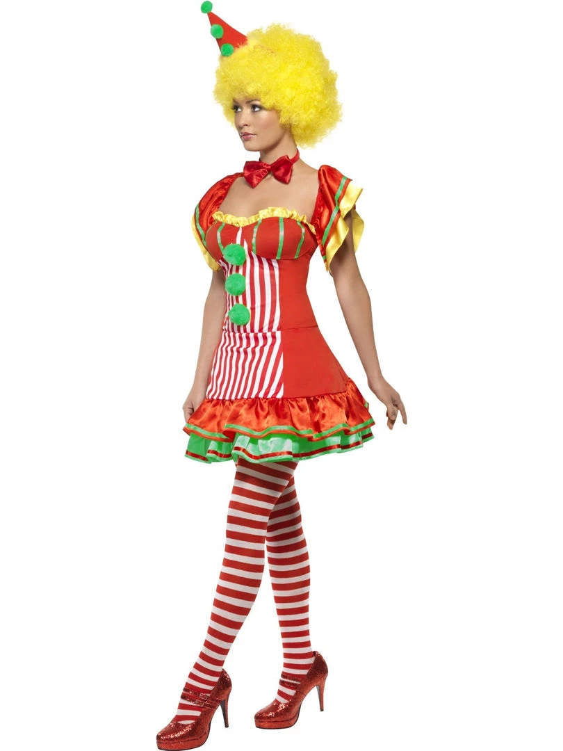Adorable red, green and yellow ruffled clown dress featuring stripes, pompoms and lots of colour!