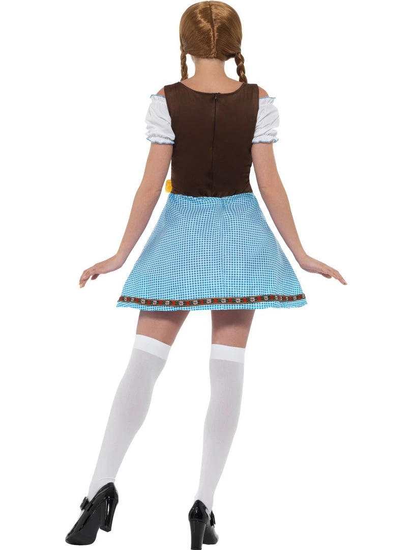 Olga Bavarian Costume, Blue & White, with Short Dress, Attached Apron, Top & Mock Suede Bodice