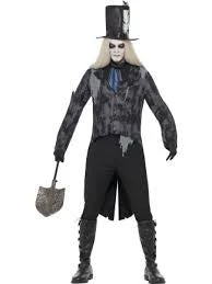 This creepy Undertaker Costume is sure to frighten party goers this Halloween. Includes Jacket, cravat and hat.
