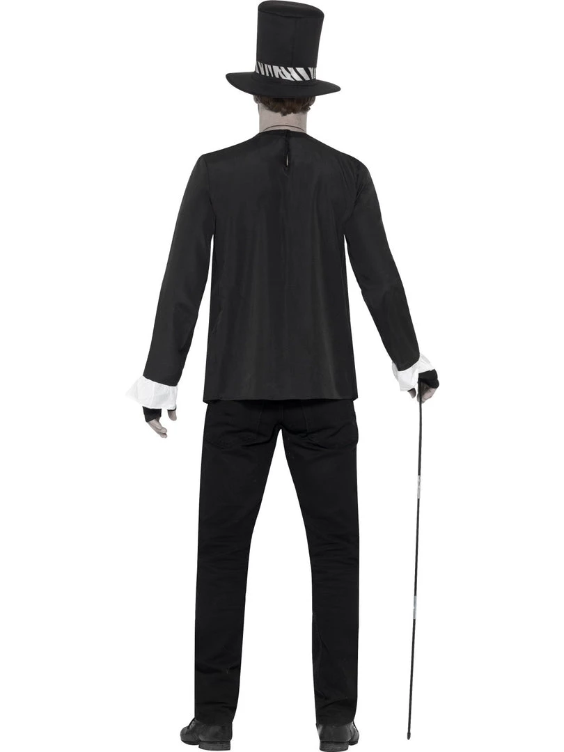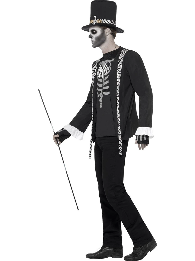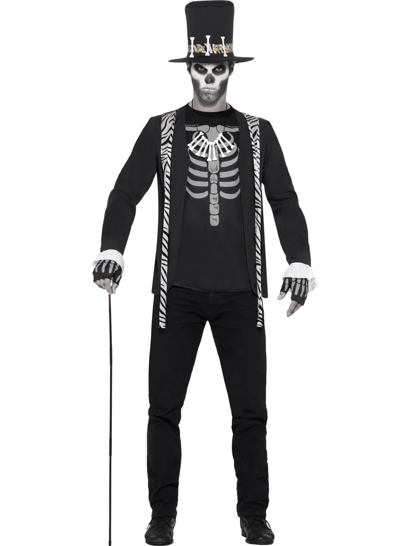 Includes mock t-shirt front with skeleton print, black jacket, hat, necklace and gloves.