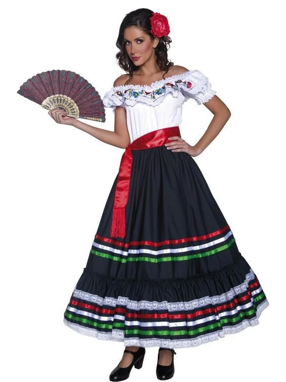 This stunning floor length dress featured a white off the should top and full swing skirt and red sash for the waist. Great for your next International or Mexican themed dress up party!