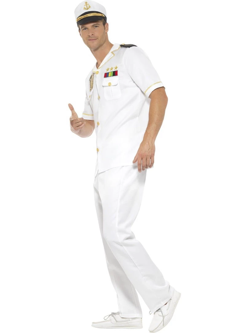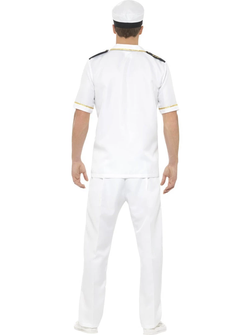 Sail the sea of fashion with this costume! White sailor costume featuring white pants, short sleeved shirt with badge and gold detailing.