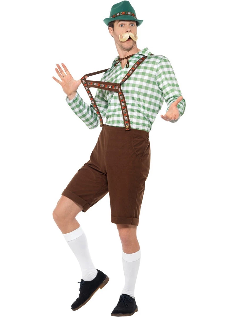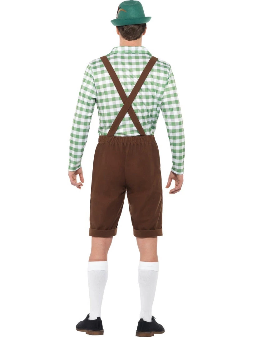This bright and fun men’s Oktoberfest costume includes a long sleeved green and white checked shirt and brown above the knee light brown cuffed material shorts with attached suspender straps!