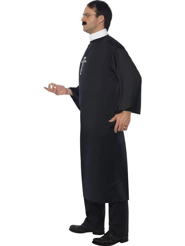 This adult men’s priest fancy dress costume which comes complete with a long black robe featuring a white collar. Add a moustache and a Cross Necklace to complete the pictured look!