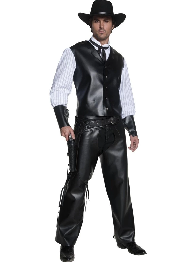 Practice your gun slinger skills like your favourite classic western movie actor in this adult mens authentic western gunslinger costume. This nifty fancy dress costume comes with a black leather look vest with attached pinstripped white faux shirt, matching leather look chaps with fringing down the legs and a black stylish dicky bow. Add our indestructible cowboy hat and Silver spurs for full effect.