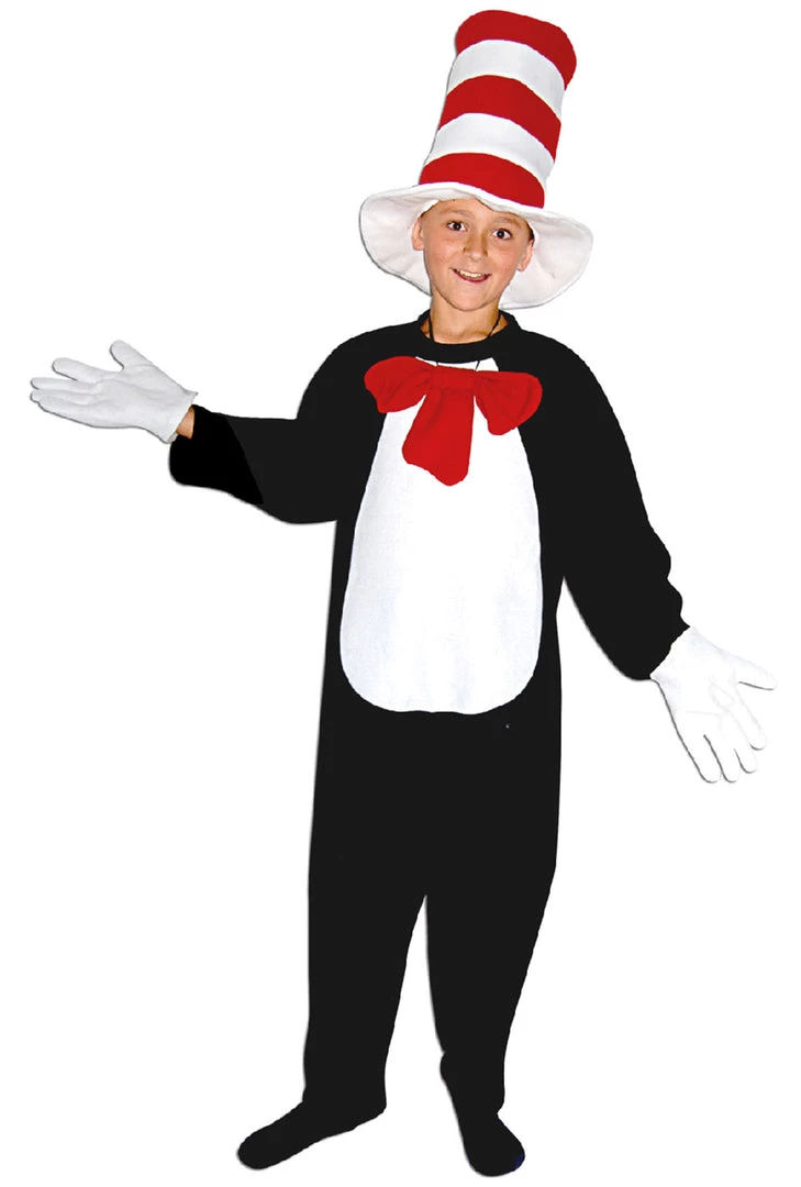 The Cat with Hat set includes a black and white onesie, a striped soft top hat, white gloves and a red elasticated bow tie. Perfect for book week!