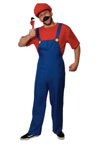 Costume includes blue overalls, a red hat and a short-sleeve red shirt.