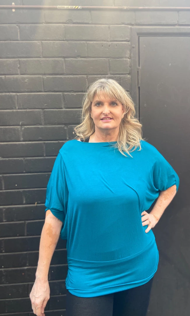 Soft and stretchy batwig top in a deep teal colour. Perfect for your next 80’s party!