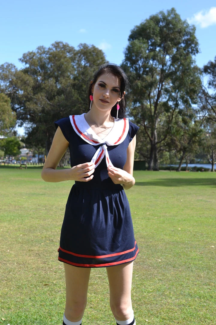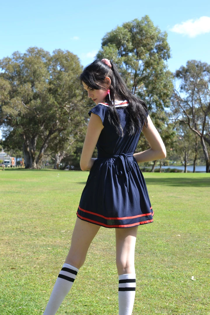 Navy sailor themed dress with white and red sailor bib and neck tie, red stripes, cap sleeves and waist tie at the back.