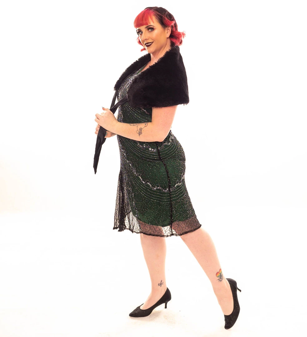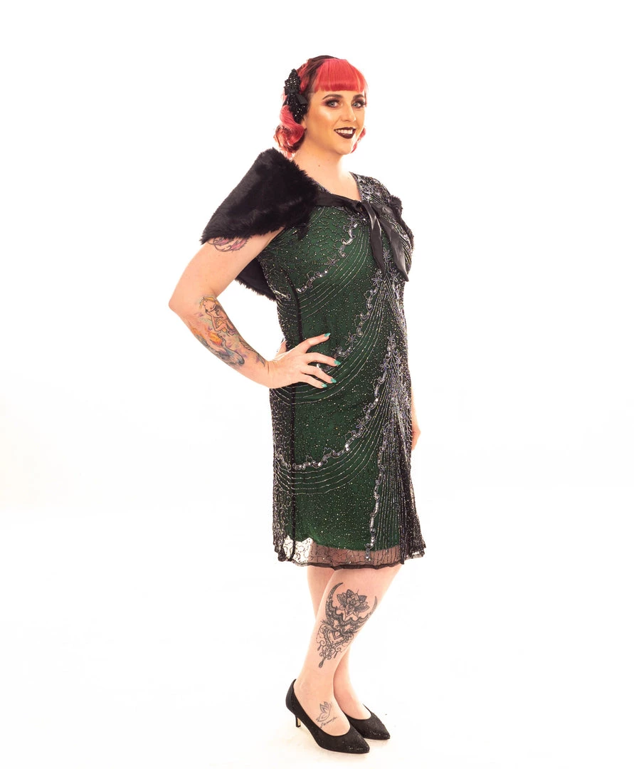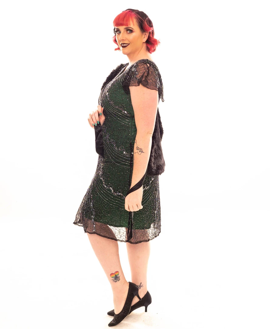 Stunning green A-frame styled dress with a flattering V shaped neckline, soft flutter sleeves, black tulle overlay with all over silver beading and sequining and zip closure under the arm.