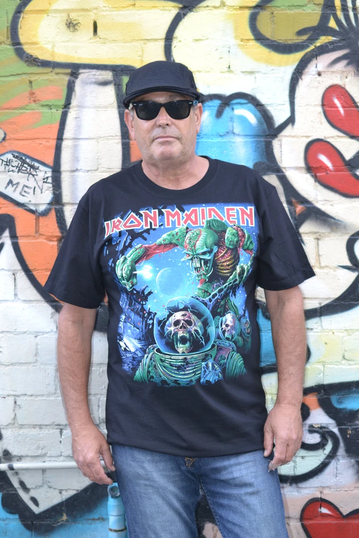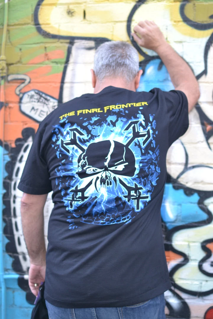 Short sleeved black t-shirt with large bold print on the front and Iron Maiden logo on the back!