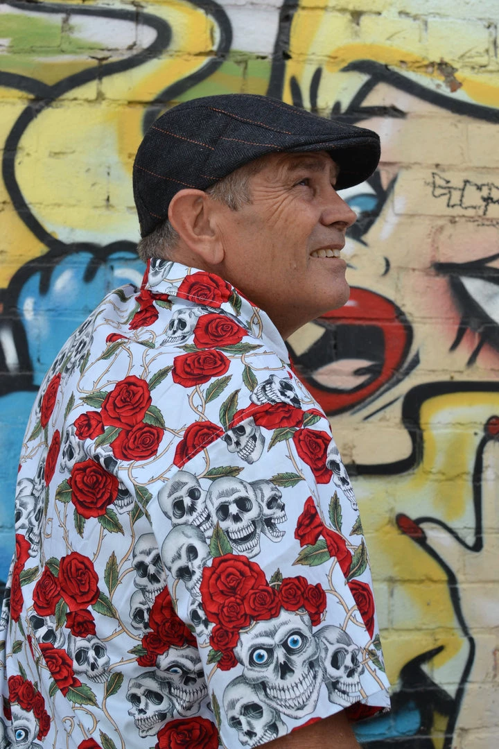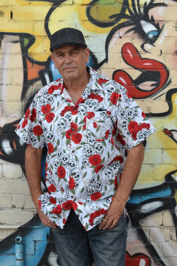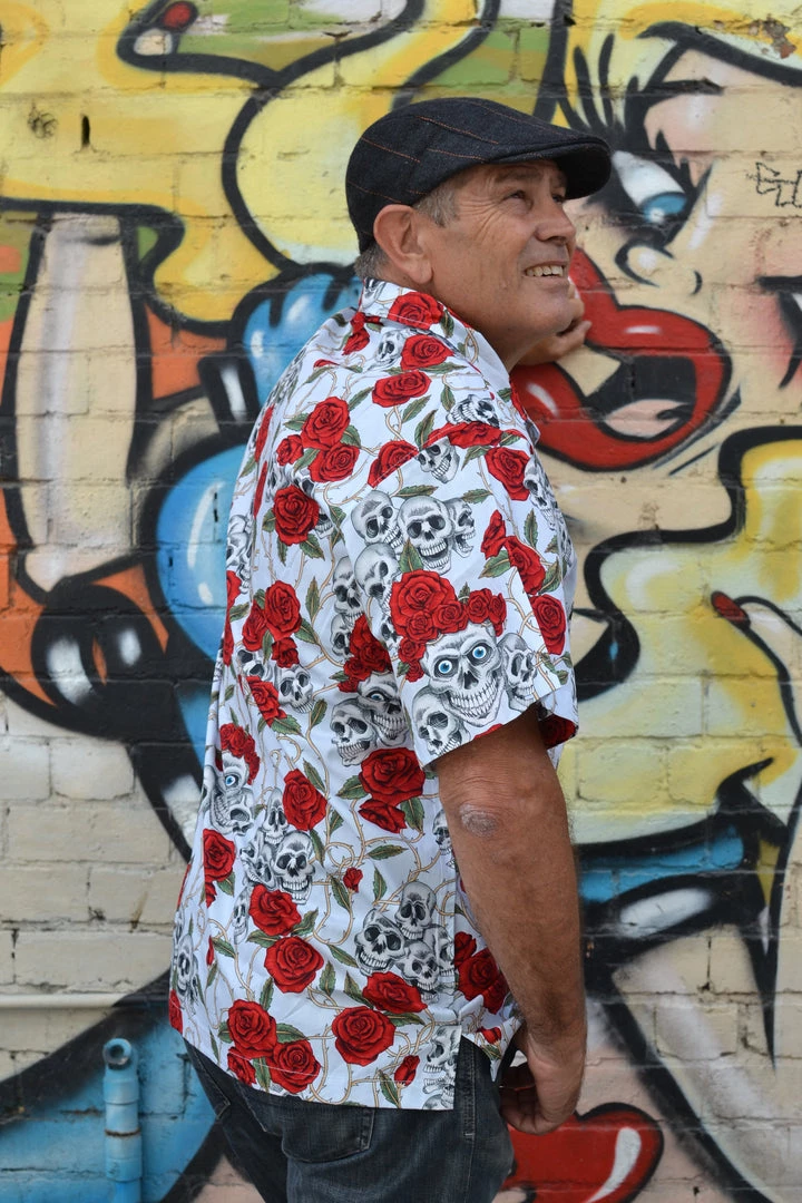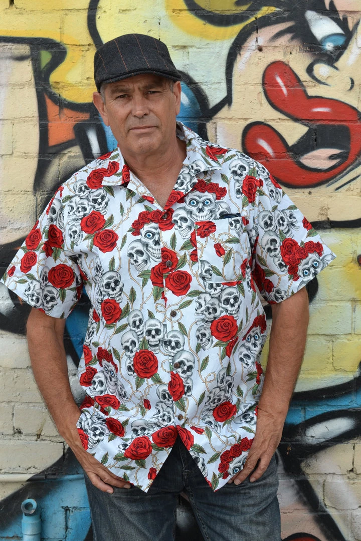 Short sleeved button down with chest pocket and button closure. Featuring an all over skull and roses print!