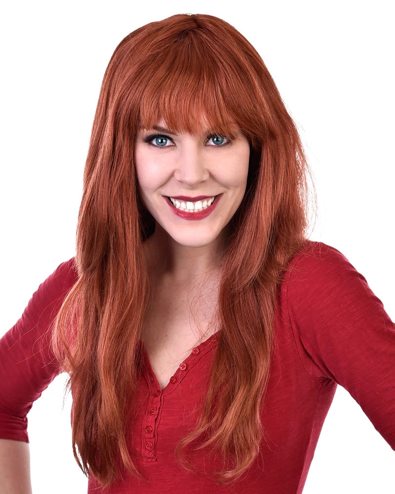 This beautiful long auburn wig with fringe is perfect for your next dress up party. Perfect for cosplay such as Black Widow or Daphne from Scooby Doo! Adults fit.