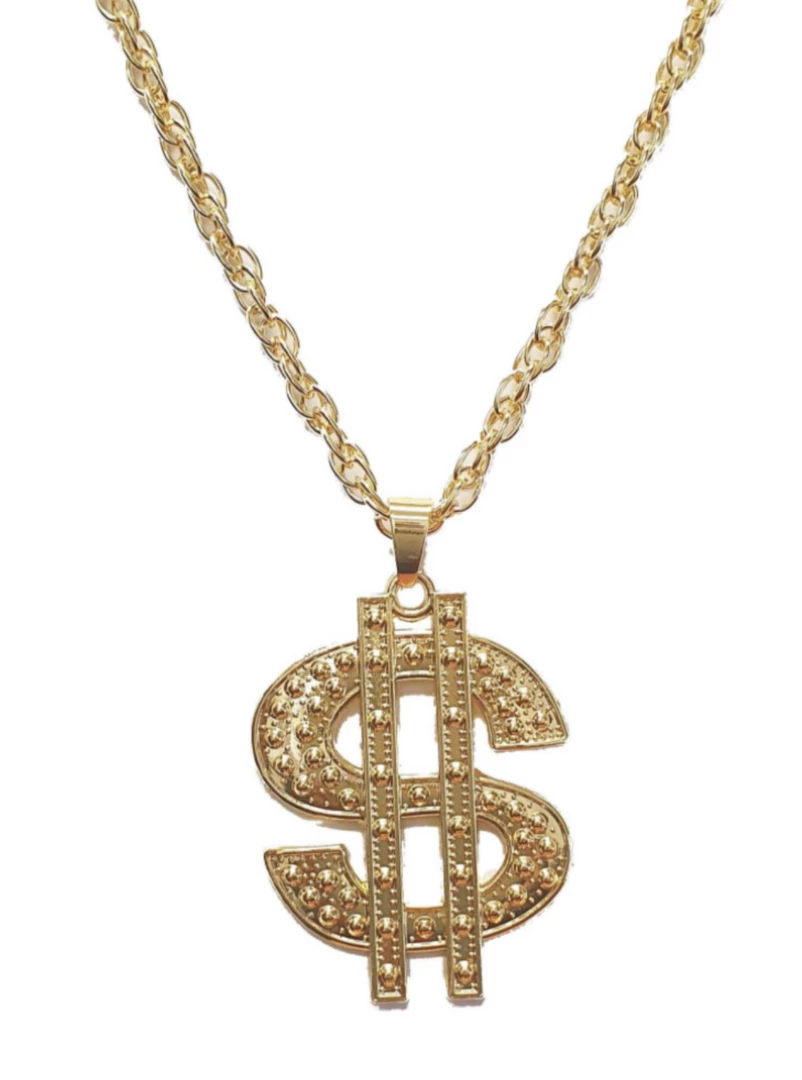 This $ dollar sign necklace is a great accessory to add sparkle to your fancy dress costume. Gold chain necklace with a Plastic Dollar Sign Pendant.