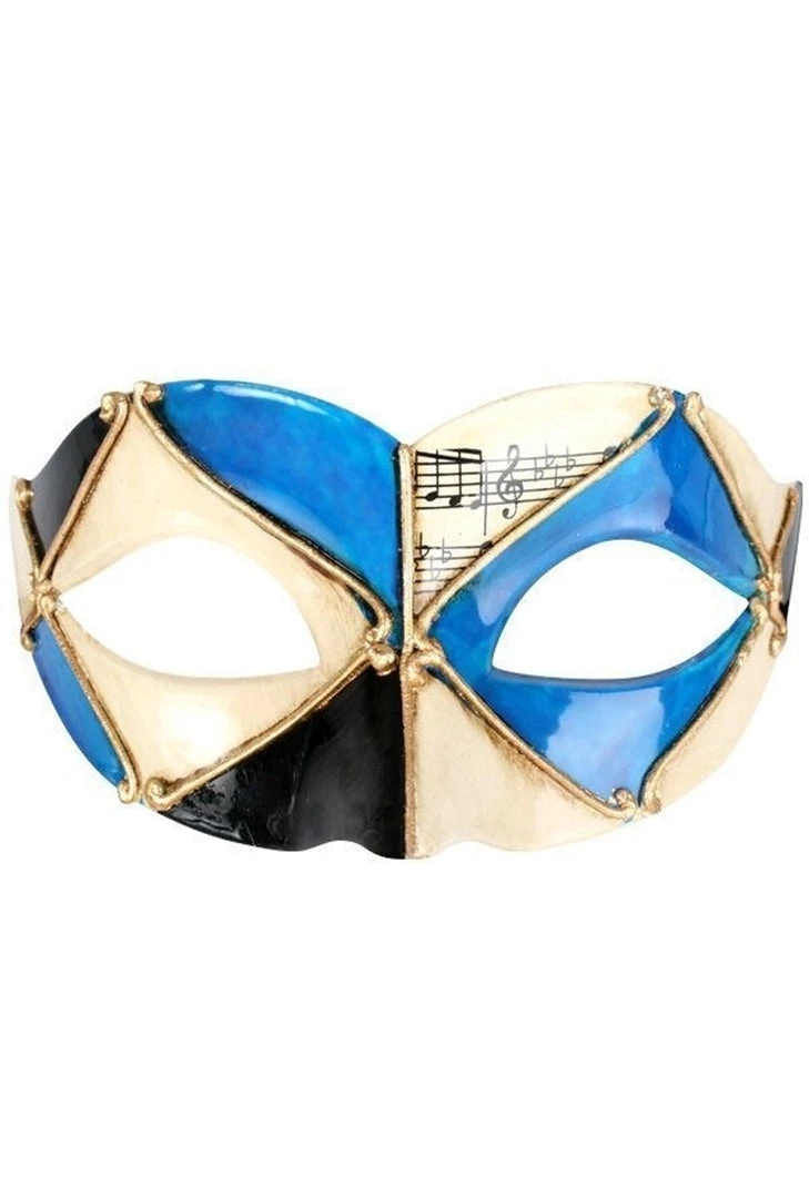 The Gold, Black and Blue Venetian Style Masquerade Mask features music note patterns, gold metallic lines and black, gold and blue alternating colours all over, Ties around the back of the head with black satin ribbon.