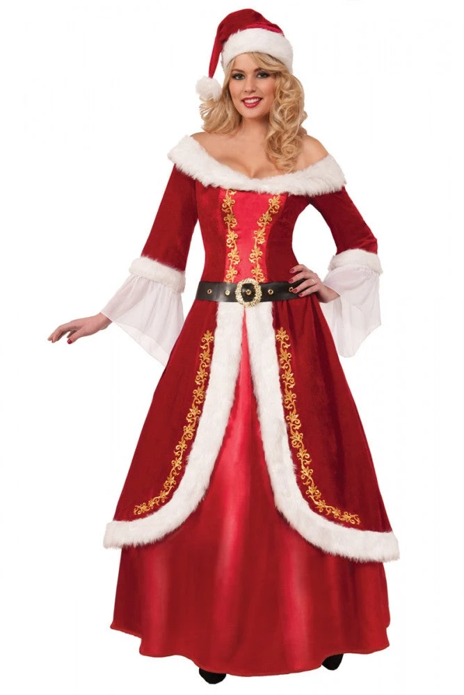The couple that creates together, stays together! That’s the motto of the Claus family and you’ll want to look the part this holiday season with our Ladies Premium Mrs. Claus Costume. It’s a beautiful attire that will complement Santa’s costume, but it’s perfect for a stand alone outfit as well. We include everything that you’ll need to immerse yourself into the role Mrs. Claus. A beautiful red strapless dress that hangs elegantly off of your shoulders. It has a white faux fur trim that graces the neckline and center of the outfit. Complementing the fur is a golden appliqués that lines the top and bottom portion of the dress. This outfit has a distinct aura that is bound to highlight your sensual design and heighten the holiday experience. Team up with Mr. Claus to make up Christmas’s most powerful couple!
