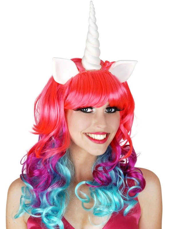Attract some attention in this majestic pink, purple and blue unicorn wig! Featuring curly hair with attached silicone white unicorn ears and horn!