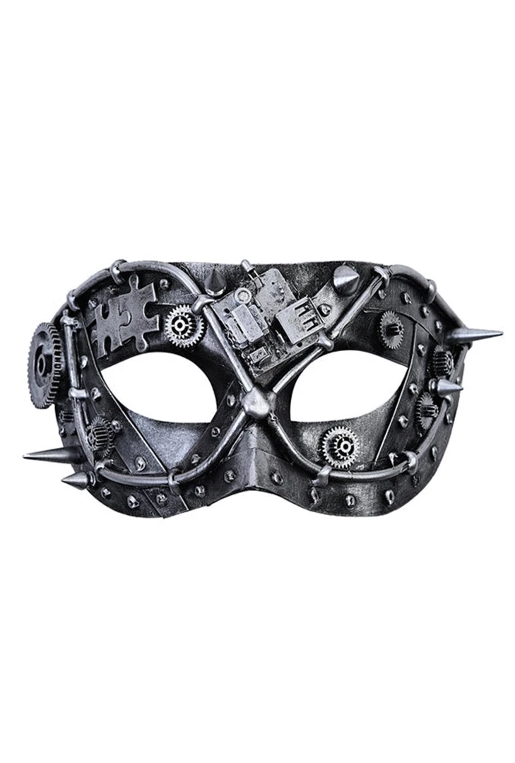 Metallic silver steampunk mask with satin ribbon ties to keep it on.