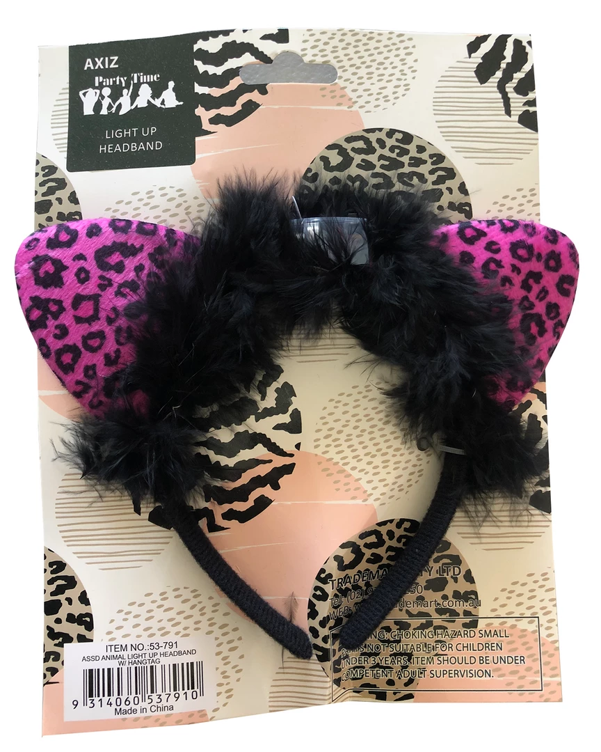 The super cute Pink Cheetah Headband has plush cat ears in a pink cheetah print with black marabou centre with a light-up switch. Perfect for your Cheetah costume!