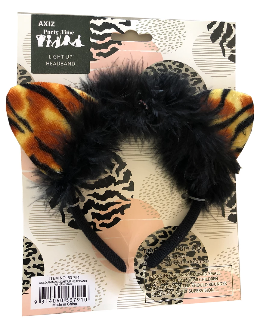 The super cute Tiger Headband has plush cat ears in a tiger print with black marabou centre with a light-up switch. Perfect for your Tiger costume!
